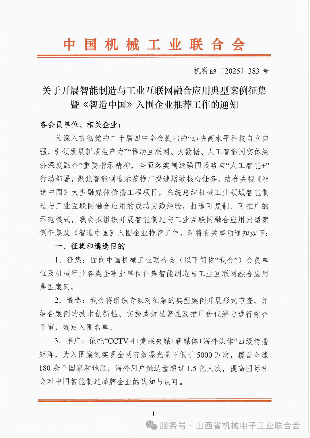 轉:中國機械工業(yè)聯(lián)合會《關于開展智能制造與工業(yè)互聯(lián)網(wǎng)融合應用典型案例征集暨<智造中國>入圍企業(yè)推薦工作的通知》